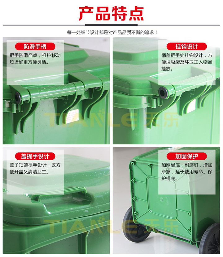 240L、120L、100L、50L、30L塑料垃圾桶、40L、20L双桶(双胞胎、干湿)垃圾桶、660L挂车垃圾桶、智能垃圾桶、户外垃圾桶、分类垃圾桶由山东天乐塑料科技有限公司提供,我公司提供桶体图案、颜色定制服务,欢迎来电咨询洽谈!