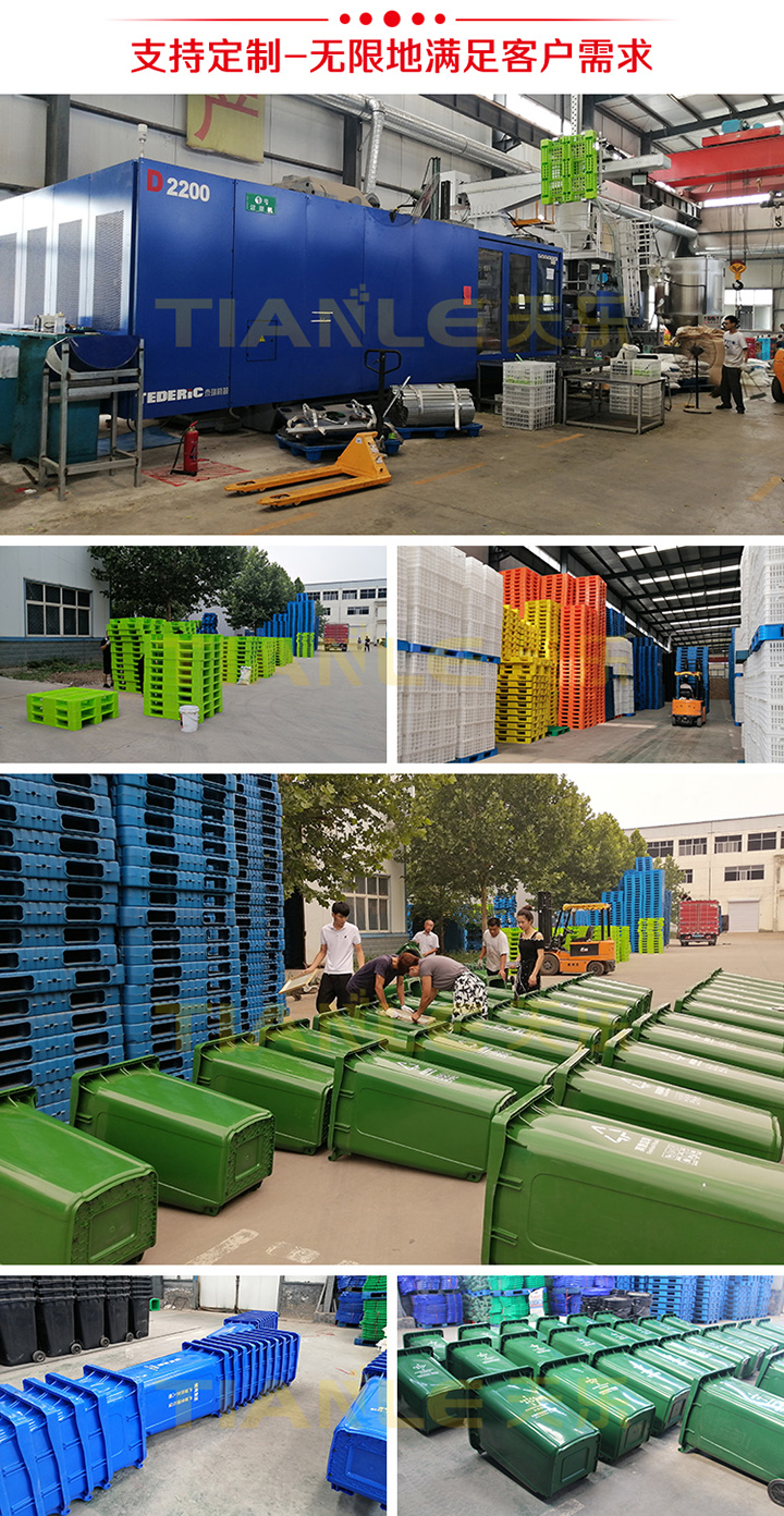 山东天乐塑料科技有限公司坐落于山东省菏泽市巨野县城东工业园,紧邻327国道,地理位置优越,交通便利。天乐塑料是一家集研发,设计,制造,销售为一体的大型生产塑料产品企业,公司拥有大型注塑、吹塑成型设备十多台,拥有经验丰富的设计研发团队,可提供产品定制服务。专业生产塑料托盘(注塑、吹塑托盘)、环卫分类垃圾桶、塑料中空板、塑料周转箱(筐)、塑料折叠箱等系列产品。